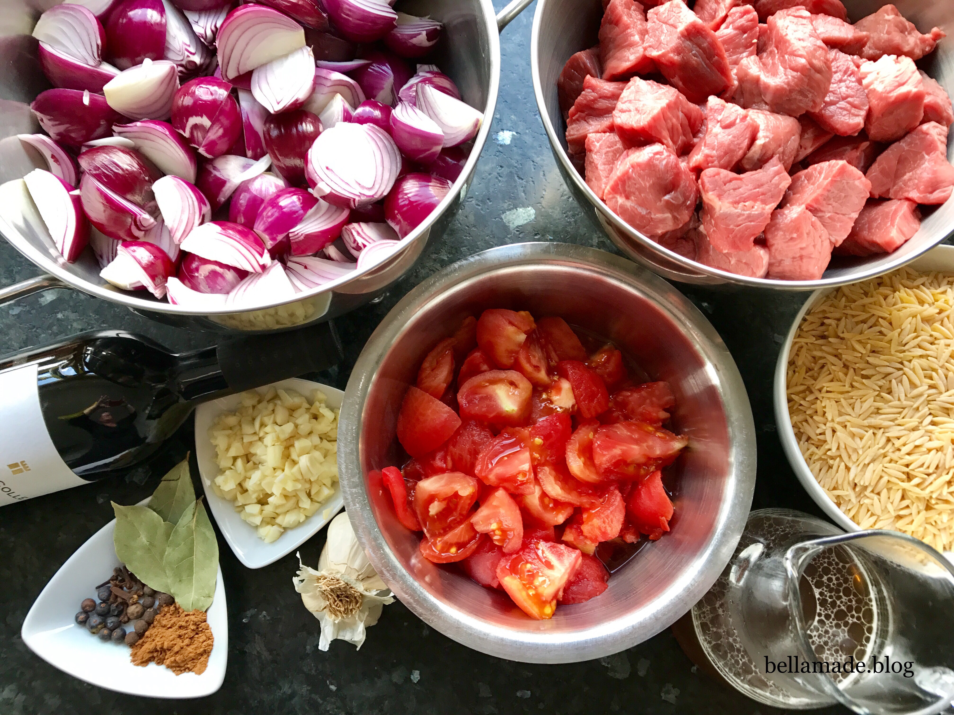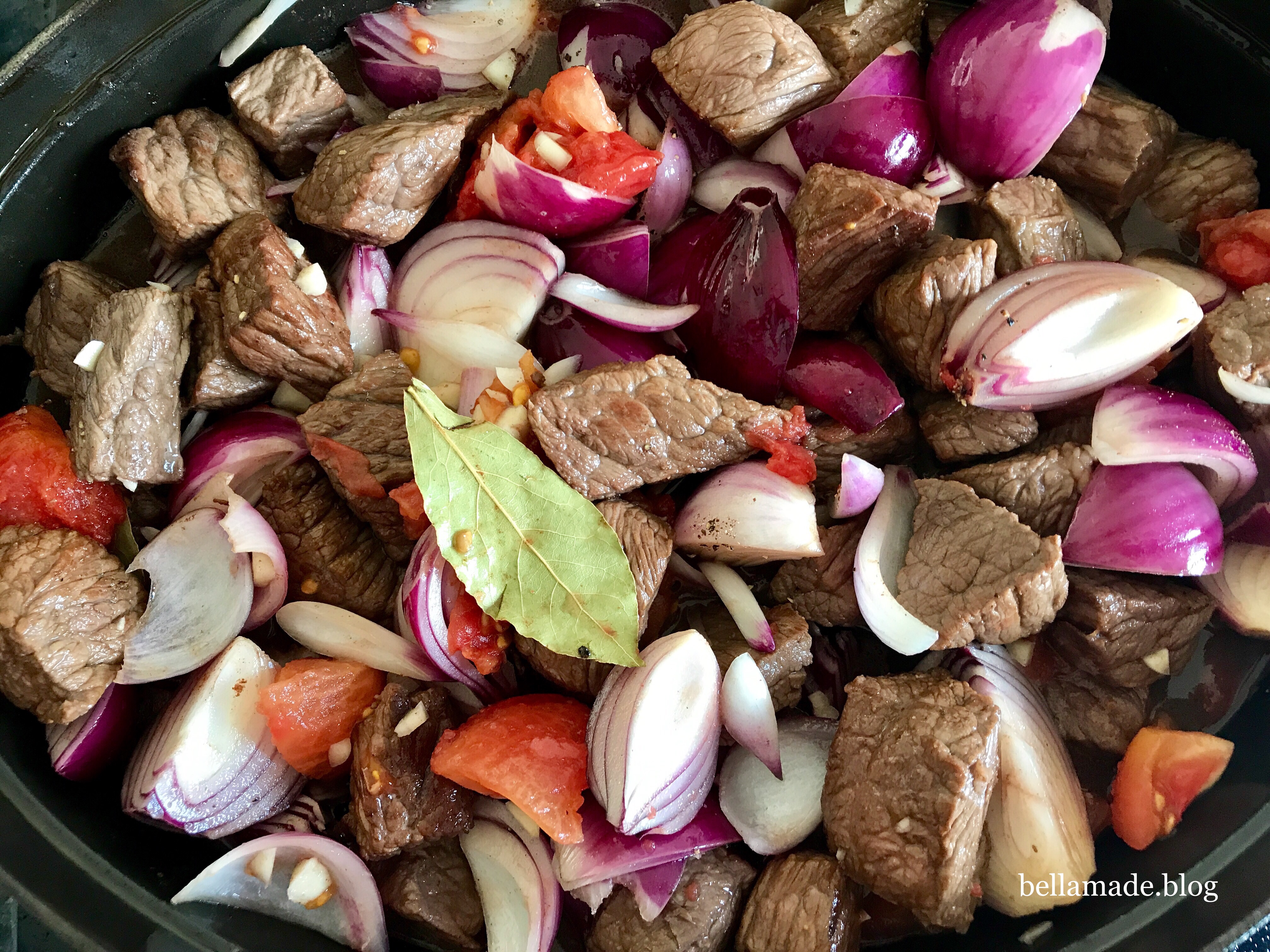 Das Fleisch – ich habe einen Rinderbraten verwendet – in Würfel schneiden. Die Zwiebeln schälen und vierten. Die Tomaten mit kochendem Wasser überbrühen, die Haut abziehen und die Tomaten vierteln. Knoblauch grob hacken. Das Fleisch in Olivenöl portionsweise anbraten. Ich habe einen gusseisernen Topf genommen. Alle anderen Zutaten zugeben und untermischen. Warten bis es anfängt zu köcheln. Deckel drauf und bei 170 Grad in den Backofen. Nach 1,5 – 2 Stunden habe ich mit Salz und Pfeffer abgeschmeckt und mit etwas Tomatenmark leicht angedickt.