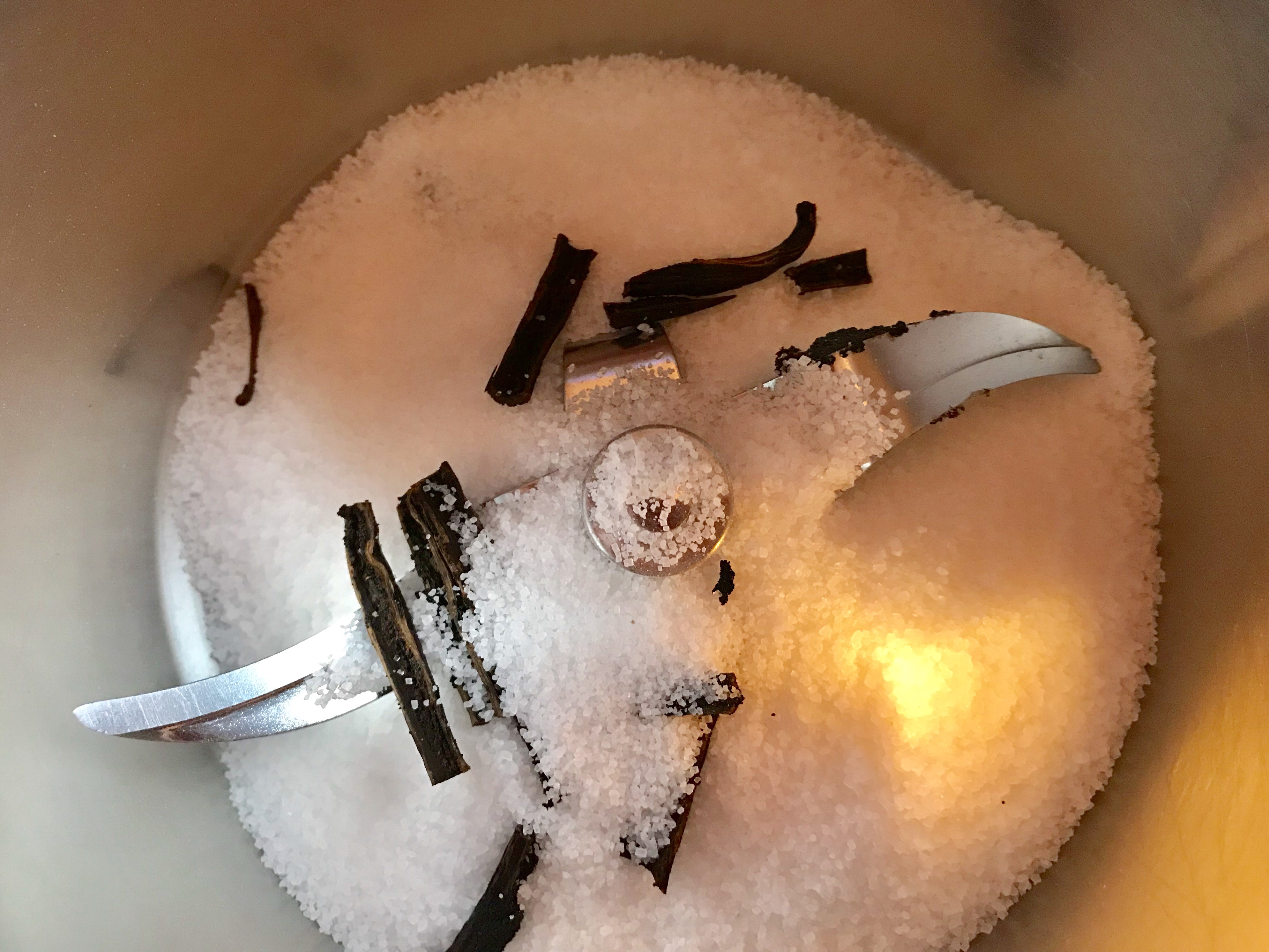 Vanilleschote aufschneiden, Mark herauskratzen und auf das Messer des Thermomix geben. Zucker und die klein geschnittene Vanilleschote dazugeben. Auf höchster Stufe 10 Sekunden pulverisieren. Ich lasse den Vanillezucker noch ein paar Minuten zur Ruhe kommen da das ganze sehr stark staubt. Fertig.