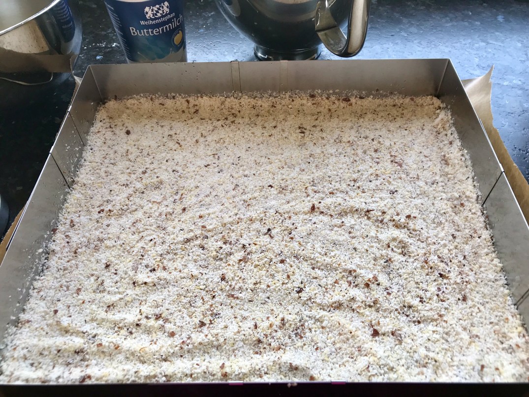 Aus den ersten Zutaten einen Teig rühren. Die Kokos-Flocken, Mandeln, Zucker und Vanillezucker mischen. Den Teig auf ein Backblech geben. Die Kokos-Mandel-Mischung darüber.