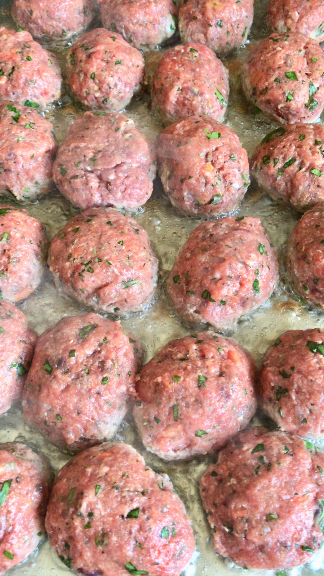 Das Hackfleisch mit allen Zutaten, außer dem Schafskäse, zu einem Teig verrühren. Daraus kleine Kugeln formen. In die Mitte eine Mulde drücken und ein Stück Schafskäse hinein geben. Jetzt eine Frikadelle daraus formen. Die Frikadellen beiseite stellen.