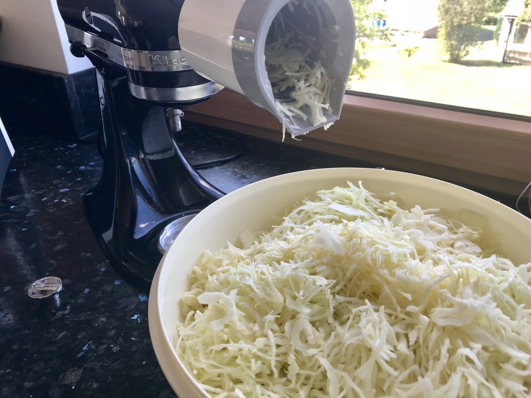 Zuerst schneide ich den Weiskohl. Das geht besonders schnell mit der Küchenmaschine. Den Weiskohl mit Salz vermischen und mit beiden Händen richtig kräftig durchkneten bis der Saft austritt. Beiseite stellen und ziehen lassen.