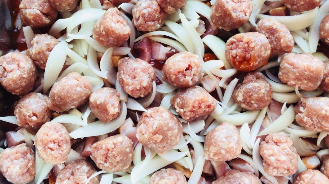Das Fleisch in Streifen schneiden. Die Bratwurst aus dem Darm zu Bällchen herausdrücken. Zwiebeln in schmale Spalten schneiden.
