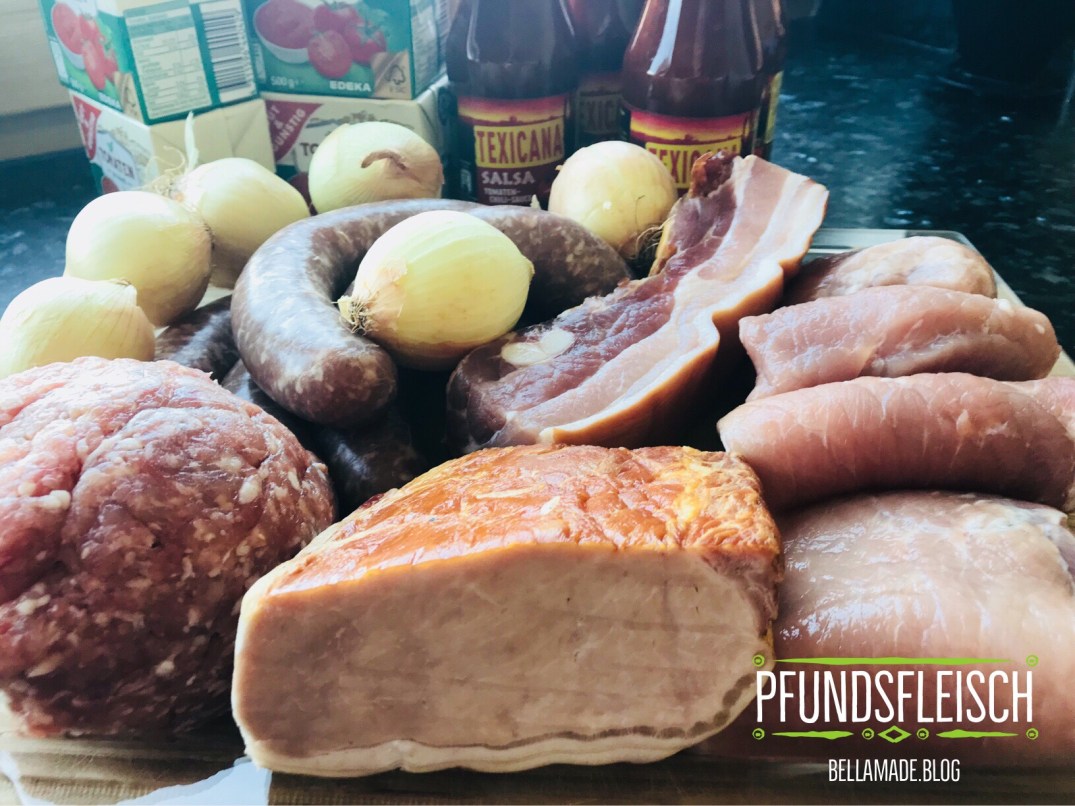 Hier das Rezept. Wie der Name schon andeutet kommt ein Pfund Fleisch rein. Aber nicht nur eine Fleischsorte. Es kommen mehrere Fleischsorten rein, die aber zu gleichen Teilen. Es ist also egal ob es ein Pfund ist, ein halbes Pfund oder ein Kilo. Es kommt darauf an welche Menge Ihr machen wollt.