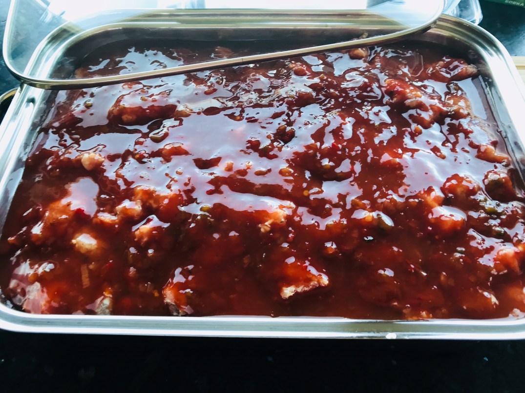 Jetzt beginnt die Schichtarbeit: Zuerst gebe ich die passierten Tomaten in den Topf, so kann nichts anbrennen. Jetzt das geschnittene Fleisch und die Hälfte der Zwiebeln. Zwei Flaschen Salsa Soße. Die Bratwurst und die restlichen Zwiebeln, zum Schluss das Mett zerpflücken und in die Zwischenräume geben. Die restliche Salsa Soße drüber, abdecken und kaltstellen. Ein paar Stunden oder über Nacht durchziehen lassen.