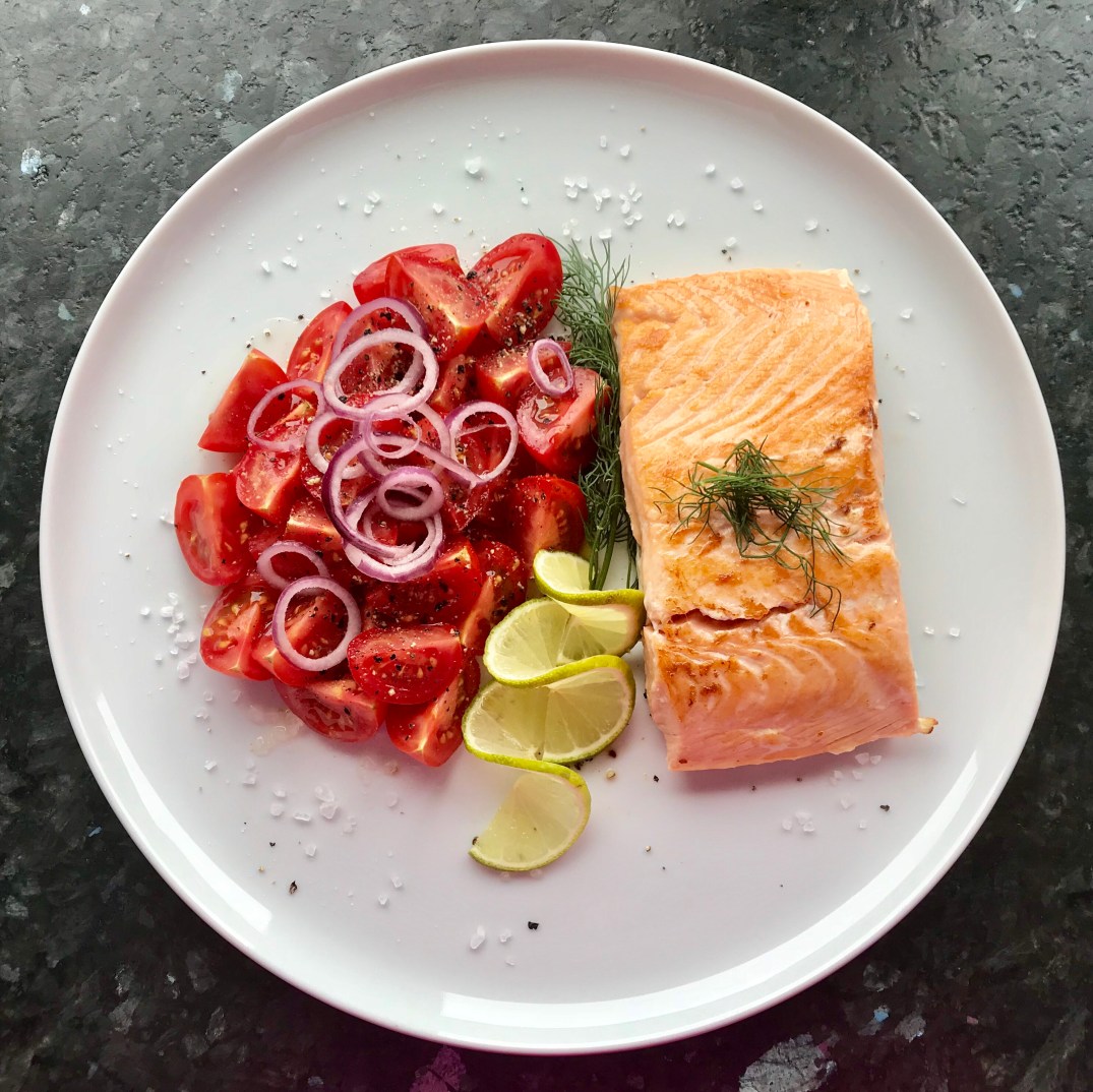 Und ich bekomme meinen Lachs. Ohne Kartoffeln. Dafür mit Tomatensalat. Tomaten schneiden, Olivenöl, Limettensaft, Salz, Pfeffer, Dill.