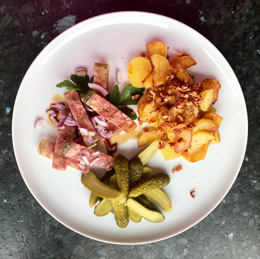 Für den Chef natürlich Sülze. Mariniert mit Rapsöl, Orangenbalsamico, Salz, Pfeffer. Dazu Bratkartoffeln mit Speck und Gewürzgurken.