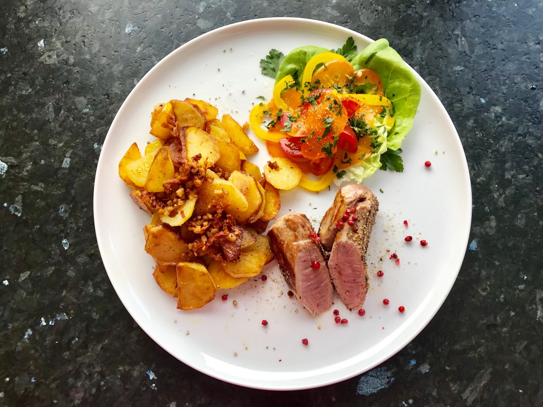 Samuel mag viel Pfeffer und die kleine Salatbeilage. Also: Bratkartoffeln, Schweinefilet mir roter Pfefferbeere, Alibisalat.