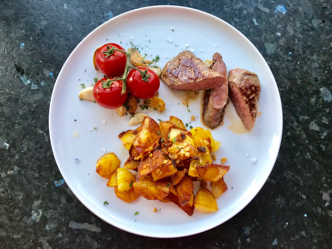 David teilt meine Tomatenliebe. Er möchte das Lamm. Also: Bratkartoffeln, Lamm, gegrillte Tomaten auf gegrilltem Knoblauch.