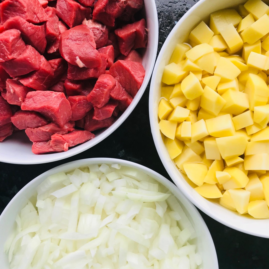 Zuerst das Geschnippsel. Das Fleisch in Würfel schneiden. Ich kaufe statt fertigem Gulasch lieber einen schönen Braten und schneide das Fleisch selbst. Die Kartoffeln schälen und würfeln, in einer Schüssel mit Wasser bedecken. Zwiebeln schälen und würfeln. Die Tomaten einritzen, mit heißem Wasser übergießen und häuten. In Würfel schneiden.