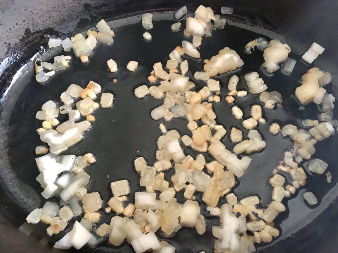 Speck fein würfeln und im gusseisernen Topf auslassen. Die ausgelassenen Speckwürfel entfernen.