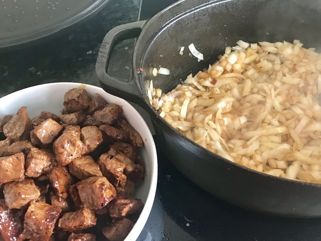 Das Fleisch portionsweise anbraten. Die Zwiebeln ebenfalls anbraten. Das Fleisch wieder zurück in den Topf geben. Mit der Brühe ablöschen. Die Tomaten dazu geben. Alternativ Tomaten aus der Dose. Die Kartoffeln mit dem Wasser dazu. Das Ganze kurz aufkochen. Deckel drauf und bei 180° 90 Minuten in den Backofen.