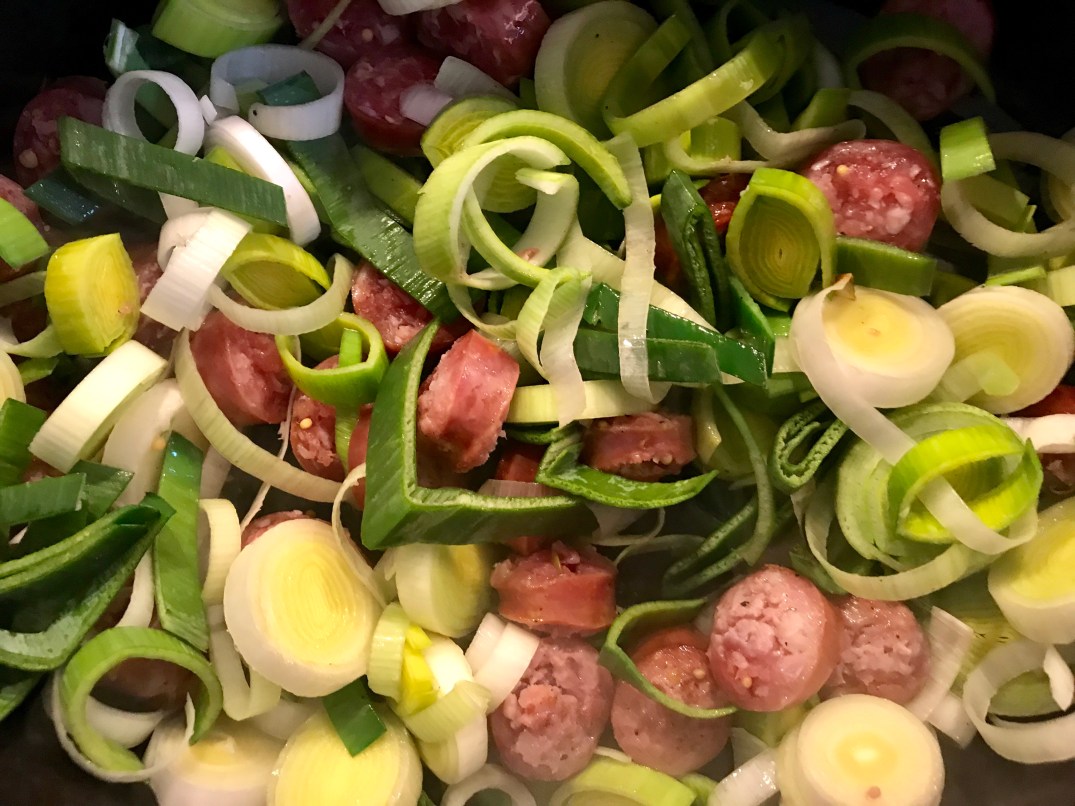 Den Porree in Ringe schneiden und mit der Mettwurst zusammen in etwas Öl anbraten.