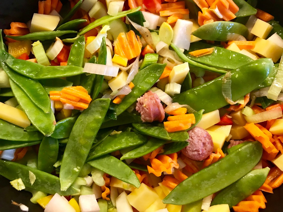 Das Gemüse kleinschneiden. 2 Mettwürste klein schneiden.