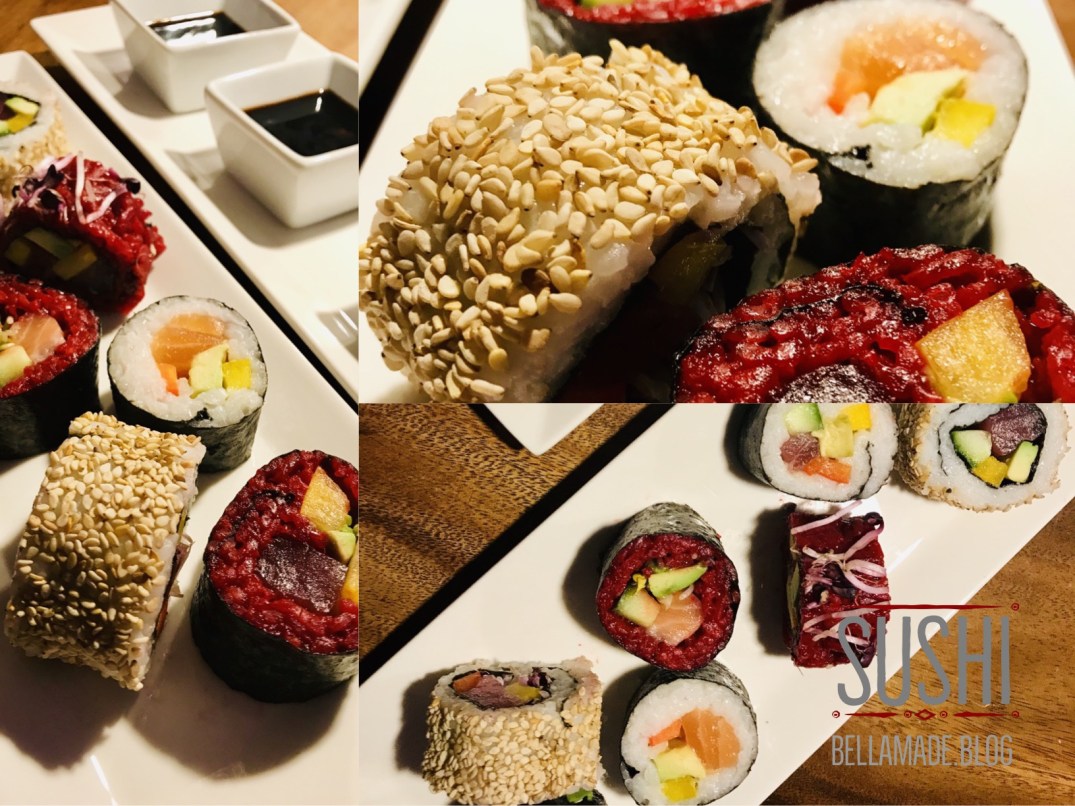 Ich habe 8 unterschiedliche Rollen gemacht. Jeweils vier mit weißem Reis und vier mit rotem Reis. Davon jeweils zwei Maki und zwei Inside-Out beziehungsweise California-Roll. durch das unterschiedliche befüllen entstand so eine herrliche Vielfalt.
