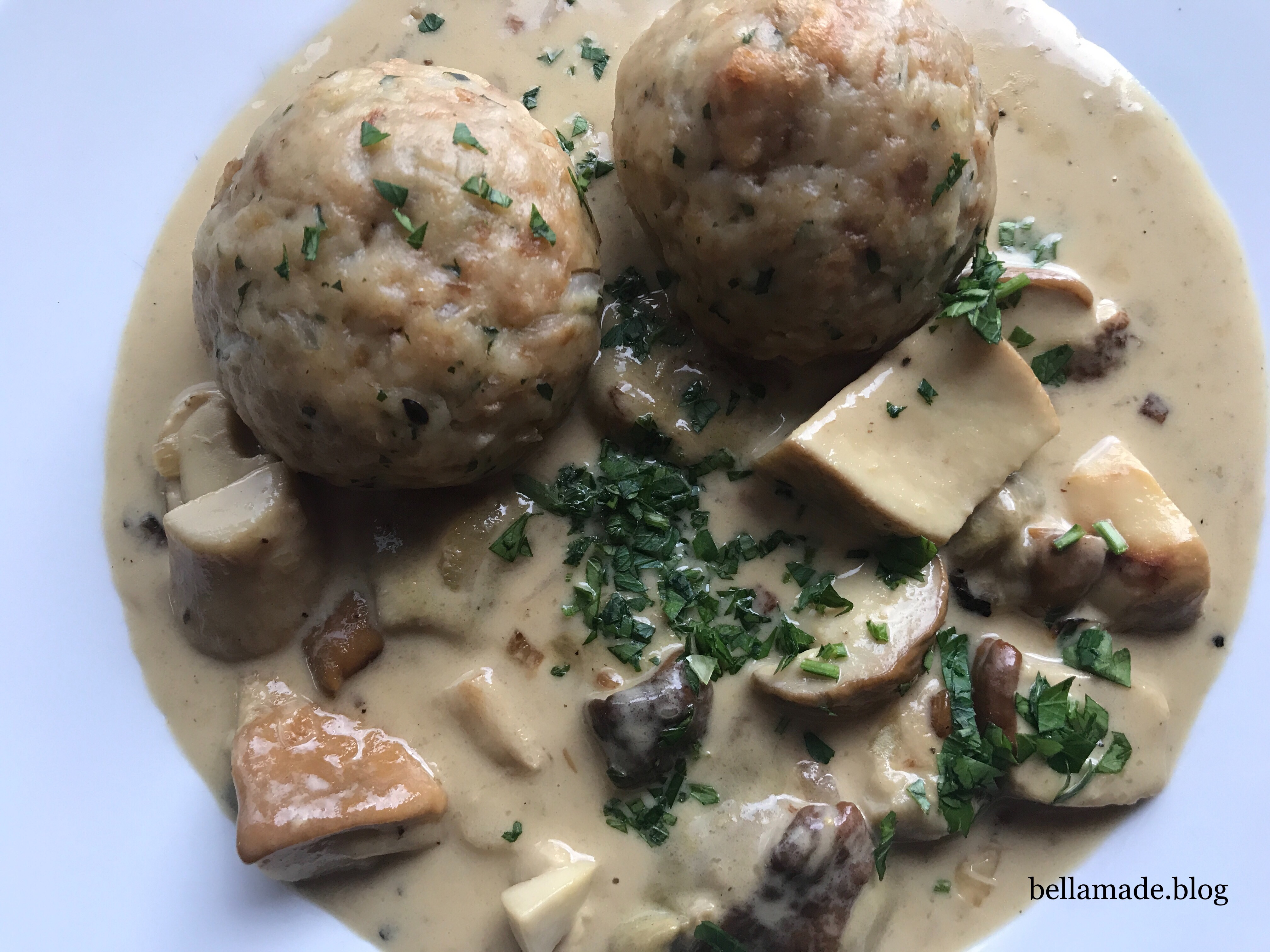 Hier also meine hochgelobten Semmelknödel mit unwiederstehlichem Pilzragout.
