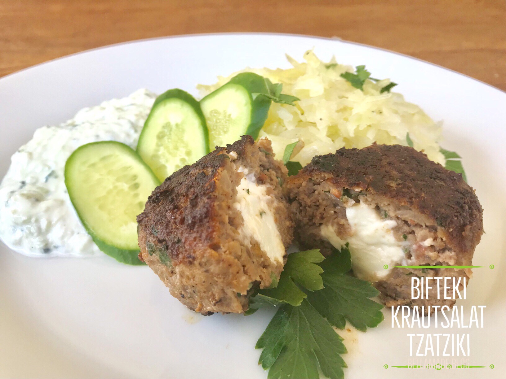 Heute mal ein griechisches Lieblingsgericht. Bifteki – Das sind griechischen Frikadellen, deftig gewürzt und mit Schafskäse gefüllte. Absolut 😋 Lecker! Dazu passt hervorragend ein selbstgemachter Krautsalat und frisches Tzatziki. Das alles selbst zu machen ist natürlich ein bisschen Arbeit. Aber, wenn du einen solchen Satz hörst: „Ich mag keinen Krautsalat, aber den hier habe ich gegessen.“ Dann hat sich der Aufwand doch gelohnt! Nicht wahr, liebe Melissa? 😉